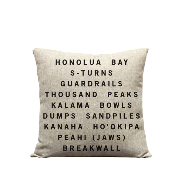 18x18in Maui Surf Scroll on a natural burlap fabric style linen pillow cover, with zipper hidden at the bottom. The linen we use is thick and very durable. The pillow fill is not included but can be purchased separately.