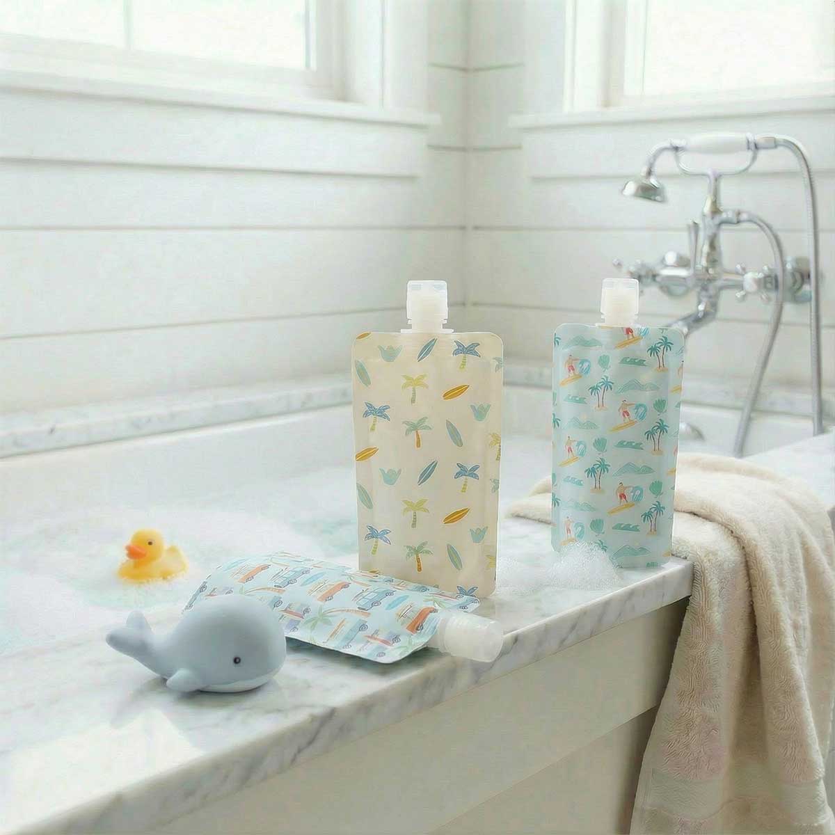 Our super cute refillable pouches are perfect for travel, the gym, your car, beach showers, and sleepovers.