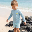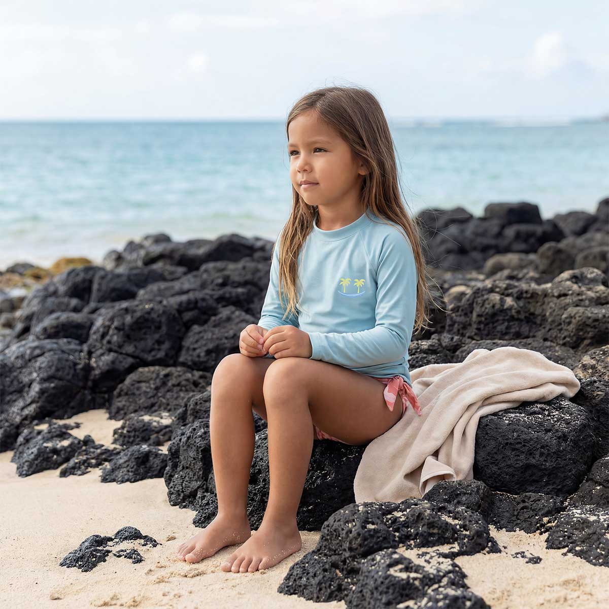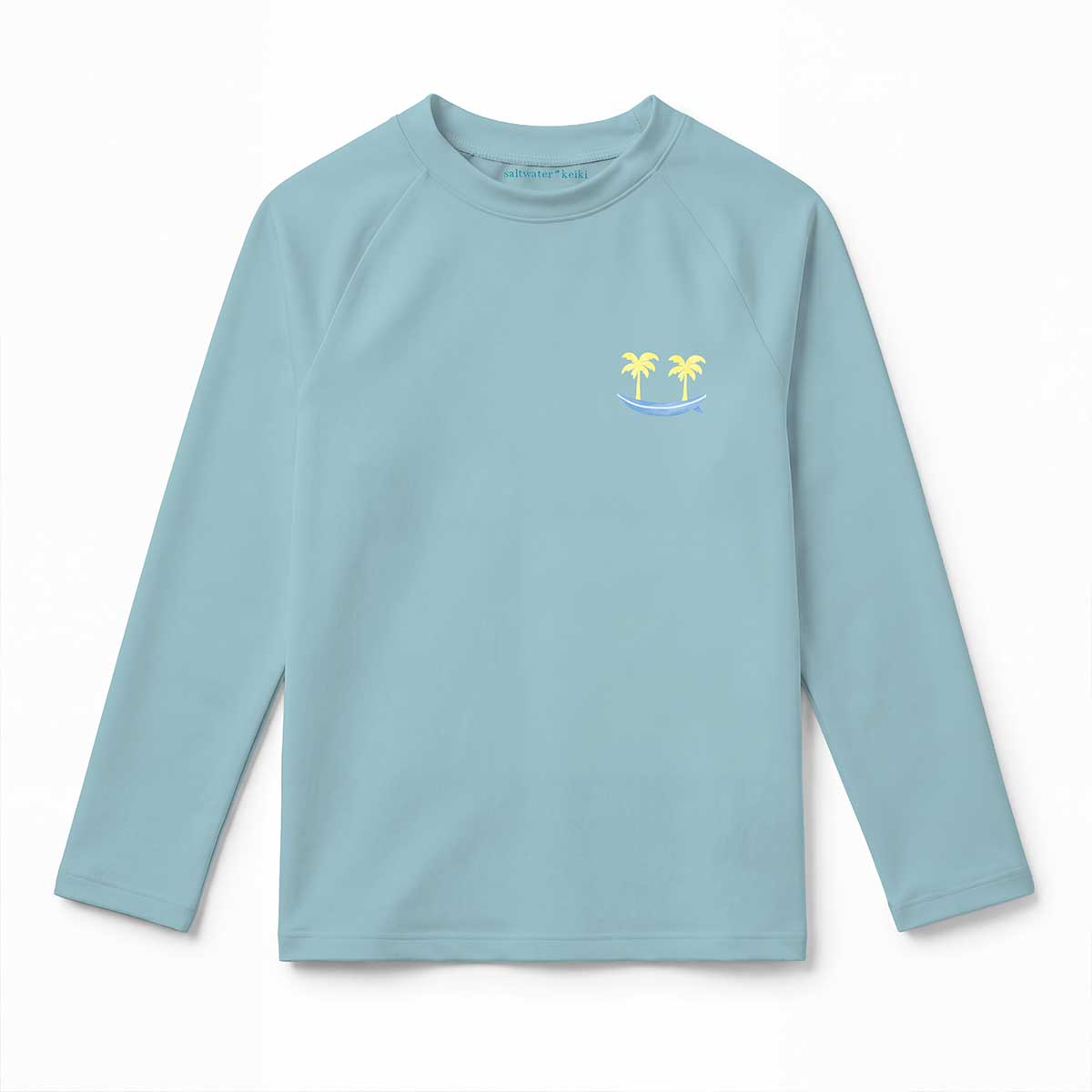 Keep little ones sun-safe in the water with our palm tree rashguard, featuring the Saltwater Keiki logo down the sleeve. Our raglan style rashguards are perfect for beach days, pool time, and every splash in between.