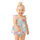 The dress features a gently gathered neckline that flows into an A-line skirt, creating a light, airy silhouette. Paired with a matching diaper cover, this style offers both functionality and charm.
