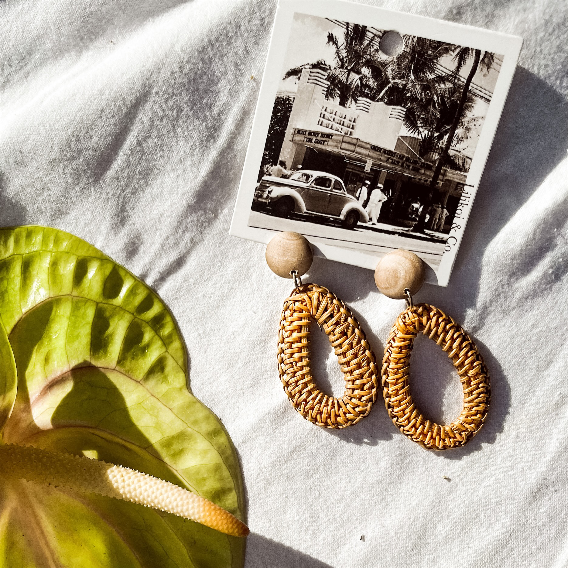 Oval Rattan Drop Earrings, Wood Top and Gold Connector