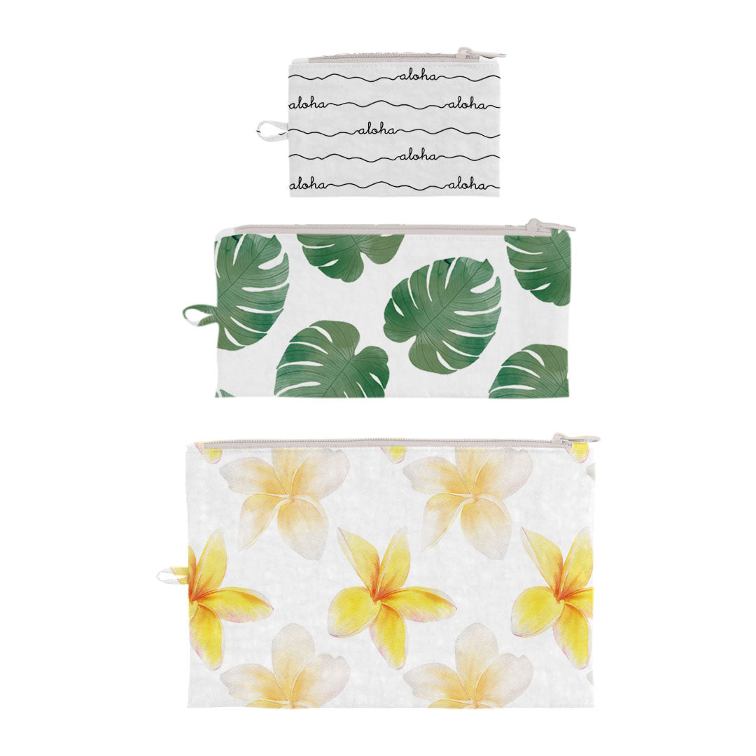 Our Set of 3 Flat Zipper Pouches are perfect for travel, makeup, toiletries, and more, these versatile pouches keep your essentials tidy. Adorned with adorable Hawaii-inspired prints, they add a touch of paradise to your daily routine. Stay organized in style with these compact, must-have accessories.