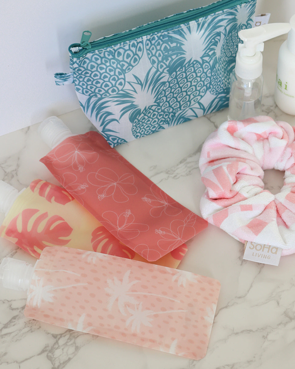 Our super cute refillable pouches are perfect for travel, the gym, your car, beach showers, and sleepovers.