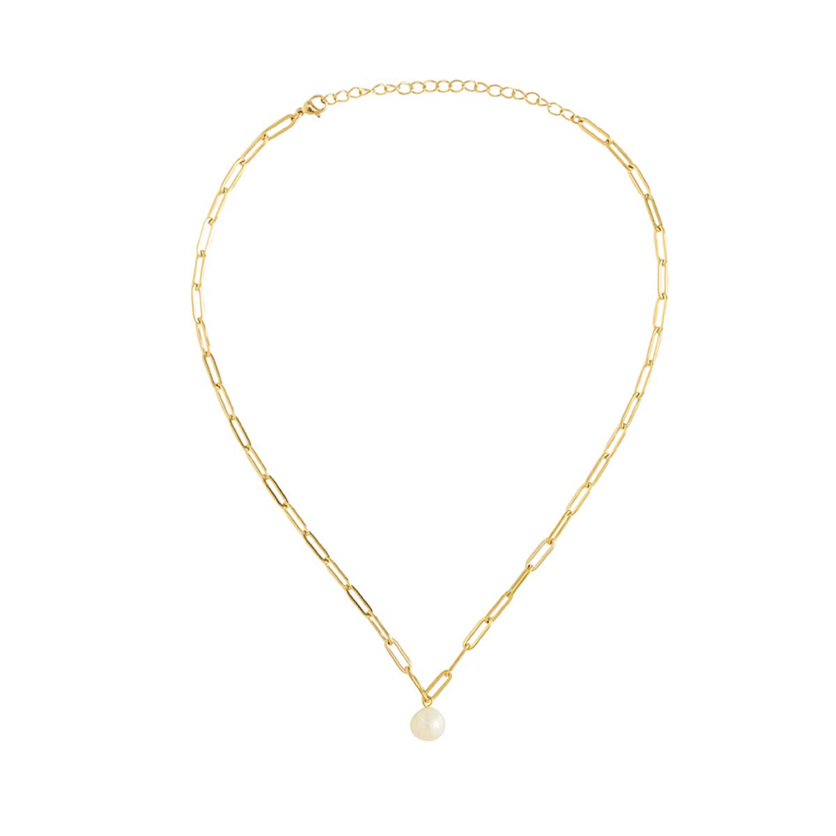 16in Manini Paperclip Necklace with White Pearl, Gold